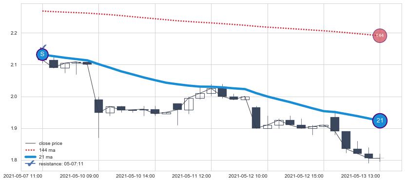 下跌趋势05-06 11:00-05-13 13:00,均线21确认关键阻力1处