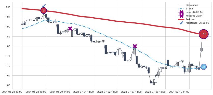 下跌趋势06-24 13:00-07-13 09:00,均线144确认关键阻力1处