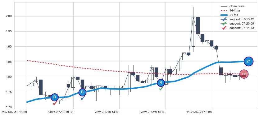 上涨趋势07-13 13:00-07-22 14:00,均线21确认关键支撑3处