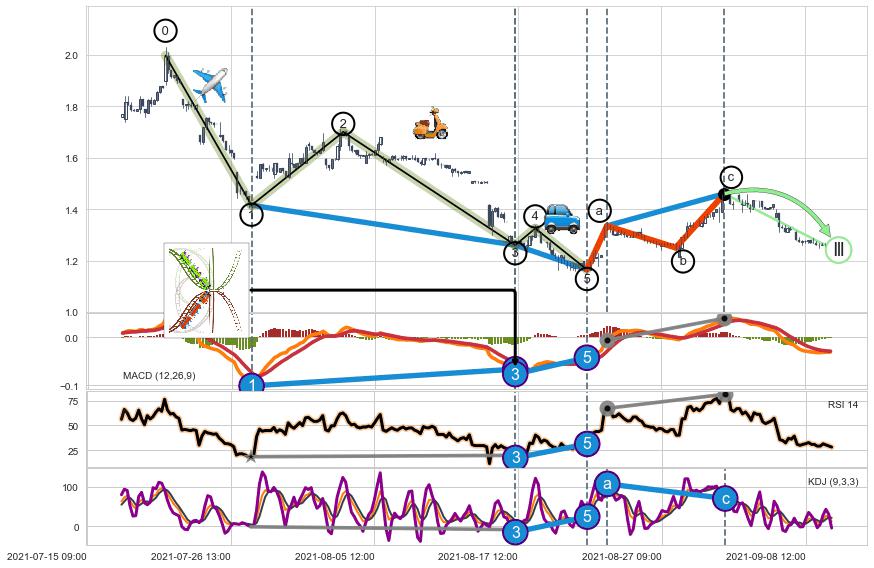 ➣ 1,3,5驱动浪MACD, RSI, KDJ走势都出现【常规背离】反转信号增强
