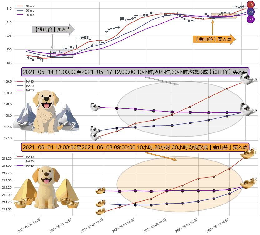 ⚃ 2021-06-01 14:00:00-小时至2021-06-03 09:00:00-小时显现 10小时-20小时-30小时均线 【金山谷】买入点 其再次确认了买入信号,可靠性更强,买入