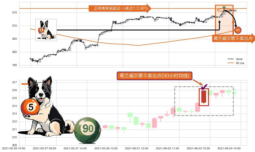 ⚀ 2021-06-03 09:00:00-小时显现 葛兰威尔均线 90小时均线 第⑤卖出点 上升趋势均值回复的短线回落信号,后市看跌,卖出信号
