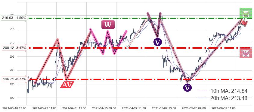 ♘ 阻力价格位219.03,可信任强度55.43%,距离最后交易2021-06-03 14:00形成的收盘价格215.61相差 +1.59%