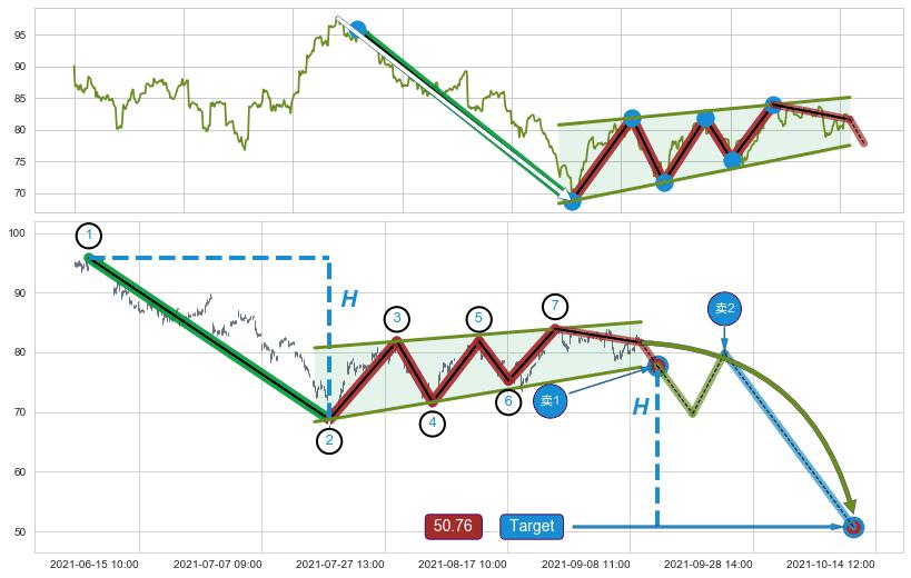 从2021-06-02 09:00至2021-07-21 13:00,共包含234个小时,阶段股价下跌-20.60%,阶段股价变动位移路程比: 1 : 6,下跌趋势角度: 47.7