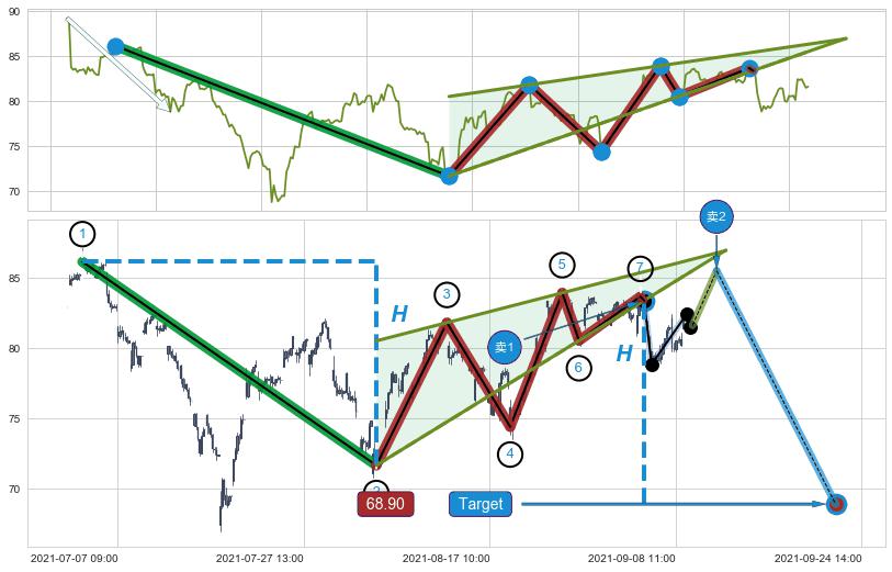 ➢ 最小中继整理跌幅→𝐇: 14.49 (𝐇楔型旗杆的长度:楔型起点→顶点)