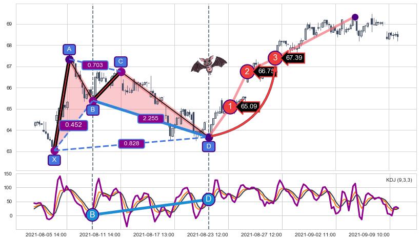 ➣ 已完成【蝙蝠】形态起点X: 08-04:14, 终点D: 08-20:09, 共73交易小时