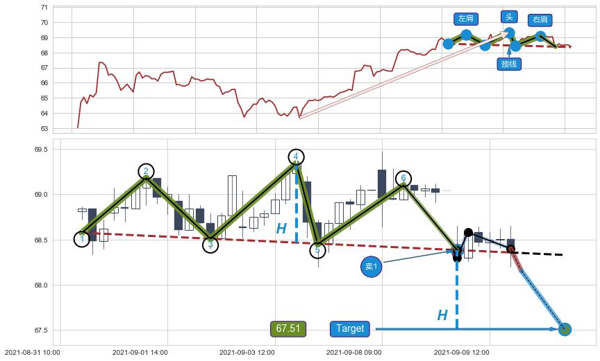 ➢ 【卖1】: 激进型 卖点→(09-09:09: 68.38 )形成突破头肩顶【反转】形态