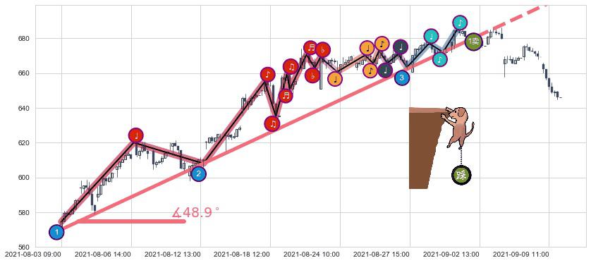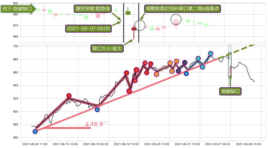 ✂️ 2021-08-03 09:00-2021-09-02 12:00上升趋势存在反转[风险],其原上升趋势的支撑位(703.23)已破位[强阻力信号],原上升趋势角度: 48.9˚
