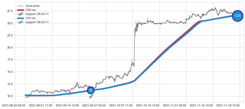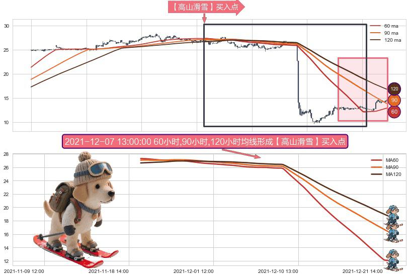 ⚀ 2021-11-19 14:00:00小时-2021-12-22 10:00:00小时显现 60小时-90小时-120小时均线 【高山滑雪】买入点 看多信号,后市看涨,买入