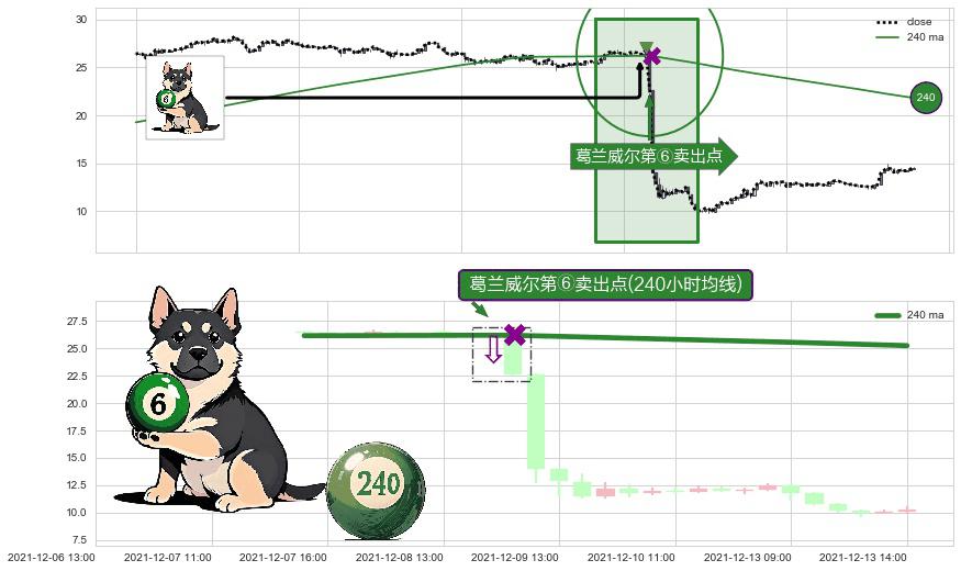 ⚀ 2021-12-08 15:00:00-小时显现 葛兰威尔均线 240小时均线 第⑥卖出点 走势反转见顶信号,后市看跌,卖出信号
