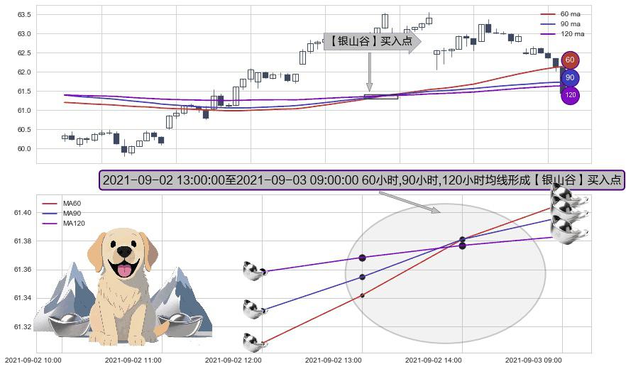 ⚀ 2021-09-02 14:00:00-小时至2021-09-03 09:00:00-小时显现 60小时-90小时-120小时均线 【银山谷】买入点 看多信号,后市看涨,买入