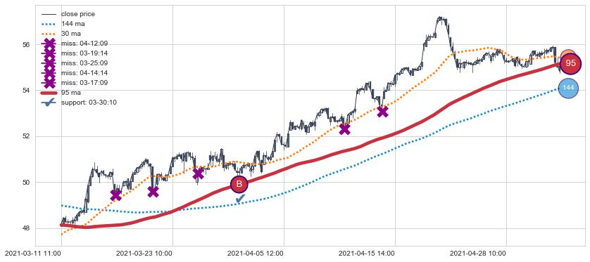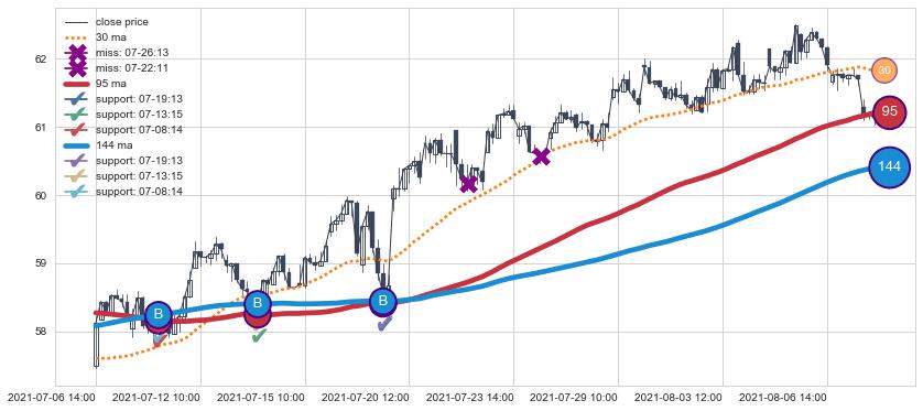 ⚅ 买点向上突破均线后,价格走势很纠结,不断在均线周围试探,有再次下探破位均线的可能