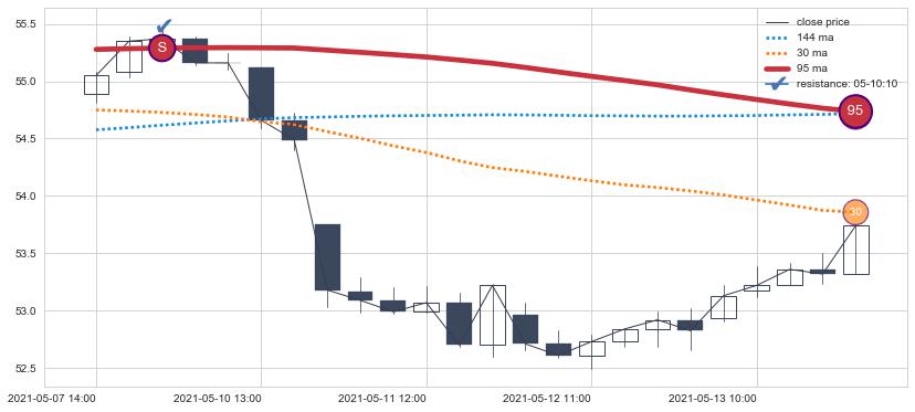 ⚃ 2021-07-28 13:00:00小时开盘价格在三条均线下收大阳线,收盘全突破均线,收盘股价上涨0.40%