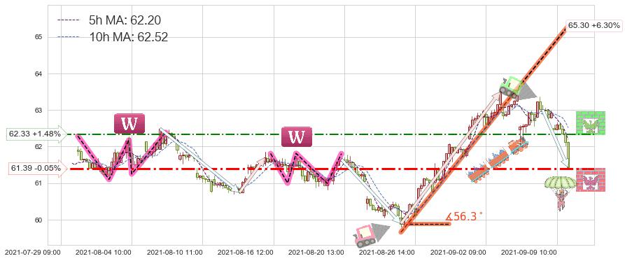♘ 阻力价格位62.33,可信任强度51.48%,距离最后交易2021-09-09 14:00形成的收盘价格61.42相差 +1.48%