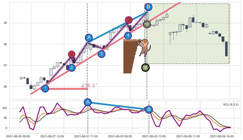 ➢ 最后的上涨趋势2021-08-26 09:00至2021-09-03 14:00:存在破位迹象,后续小调整或者反转下跌