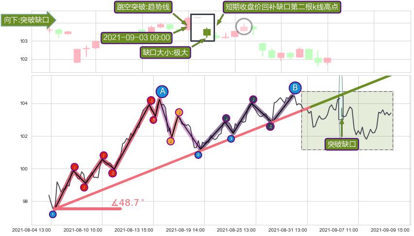 ➢ 2021-08-04 15:00-2021-08-31 15:00上升趋势存在反转[风险],其原上升趋势的支撑位(105.74)已破位[强阻力信号],原上升趋势角度: 48.7˚