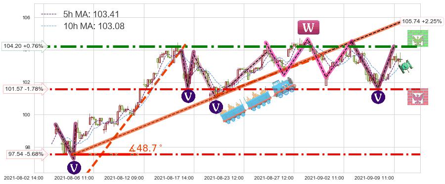 ➢ 【仅预测突破】最后价格:103.41与预测突破价格:101.26→【空间较大】后续最小【反转】第一目标价格→(09-17:10: 99.32 )