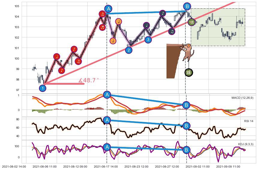 ✂️ 2021-08-04 15:00-2021-08-31 15:00上升趋势存在反转[风险],其原上升趋势的支撑位(105.74)已破位[强阻力信号],原上升趋势角度: 48.7˚
