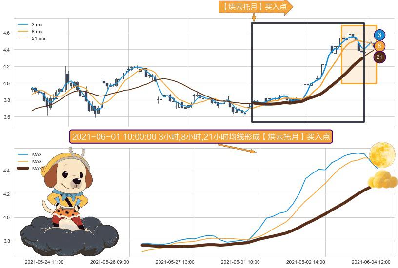 ⚀ 2021-05-26 11:00:00小时-2021-06-04 10:00:00小时显现 3小时-8小时-21小时均线 【烘云托月】买入点 看多信号,后市看涨,买入