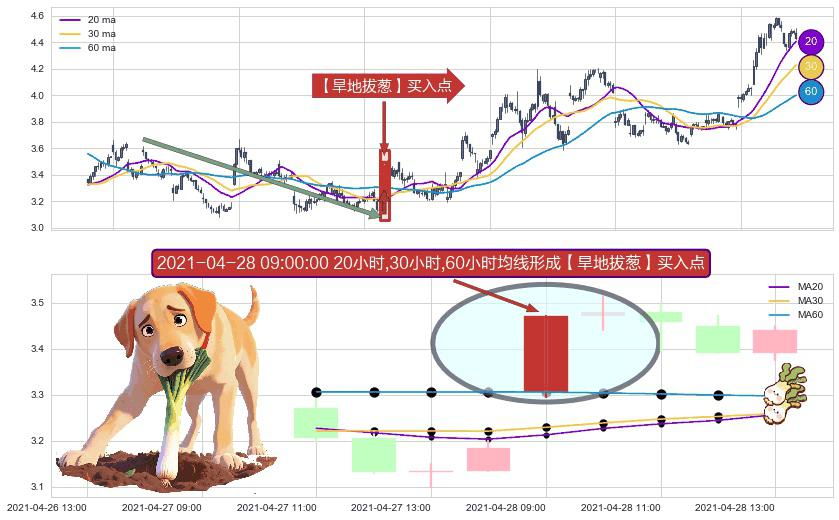 ⚀ 2021-04-28 09:00:00小时显现 20小时-30小时-60小时均线 【旱地拔葱】买入点 看多信号,后市看涨,买入