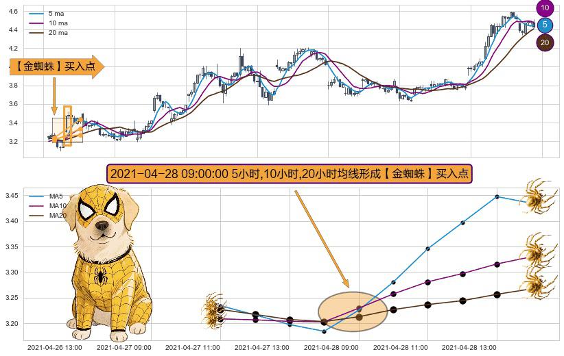 ⚀ 2021-04-28 09:00:00小时显现 5小时-10小时-20小时均线 【金蜘蛛】买入点 看多信号,后市看涨,买入