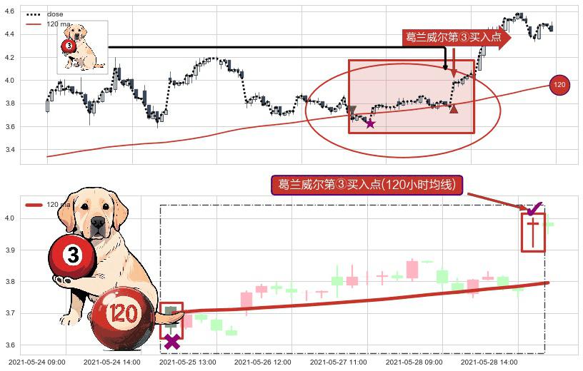 ⚀ 2021-06-01 09:00:00-小时显现 葛兰威尔均线 120小时均线 第③买入点 上升趋势的中继信号,后市看涨,买进信号