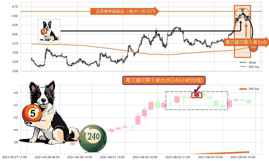 ⚀ 2021-06-03 12:00:00-小时显现 葛兰威尔均线 240小时均线 第⑤卖出点 上升趋势均值回复的短线回落信号,后市看跌,卖出信号