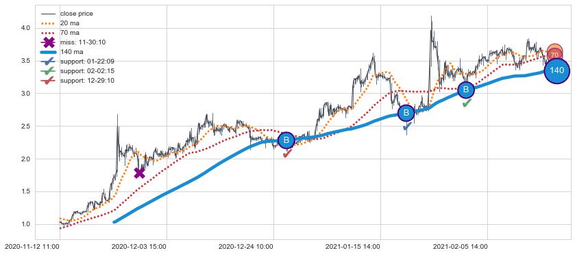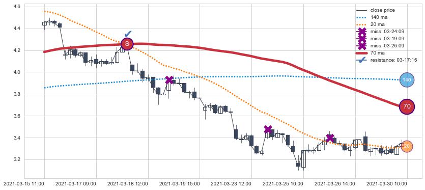 ⚁ MA3和MA8走势平行,且始终保持在短距离内,MA21始终在短中期均线下方,与短中期均线保持一定的距离,微微上行