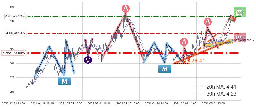 ♘ 阻力价格位4.65,可信任强度55.36%,距离最后交易2021-06-04 14:00形成的收盘价格4.42相差 +5.12%