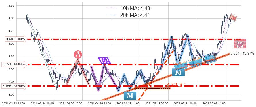 ♘ 支撑价格位4.09,可信任强度59.25%,距离最后交易2021-06-04 14:00形成的收盘价格4.42相差 -7.55%