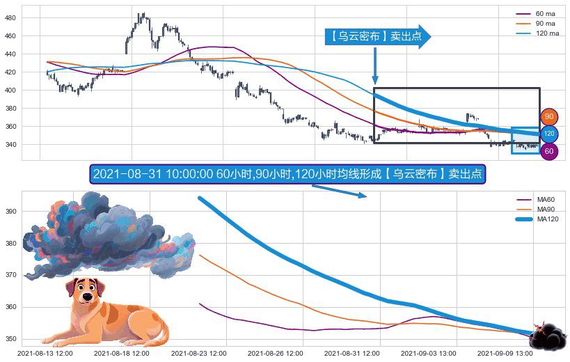 ⚀ 2021-08-20 12:00:00小时-2021-09-09 15:00:00小时显现 60小时-90小时-120小时均线 【乌云密布】卖出点 看空信号,后市看跌,卖出