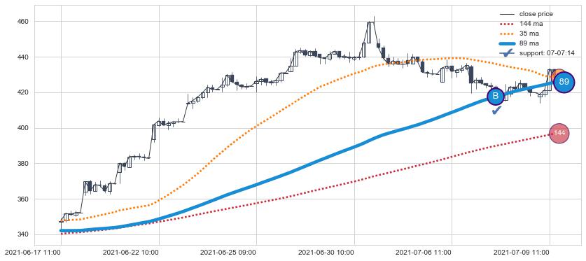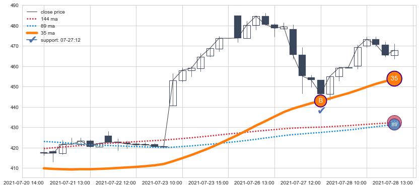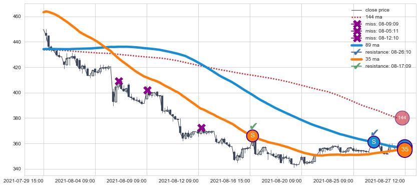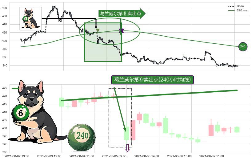 ⚀ 2021-08-05 09:00:00-小时显现 葛兰威尔均线 240小时均线 第⑥卖出点 走势反转见顶信号,后市看跌,卖出信号