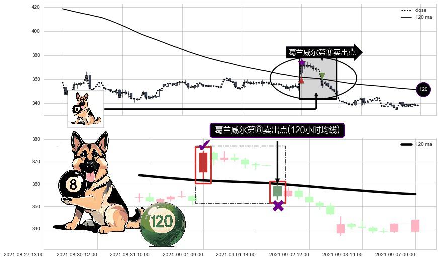 ⚀ 2021-09-02 09:00:00-小时显现 葛兰威尔均线 120小时均线 第⑧卖出点 下降趋势的中继信号,后市看跌,卖出信号