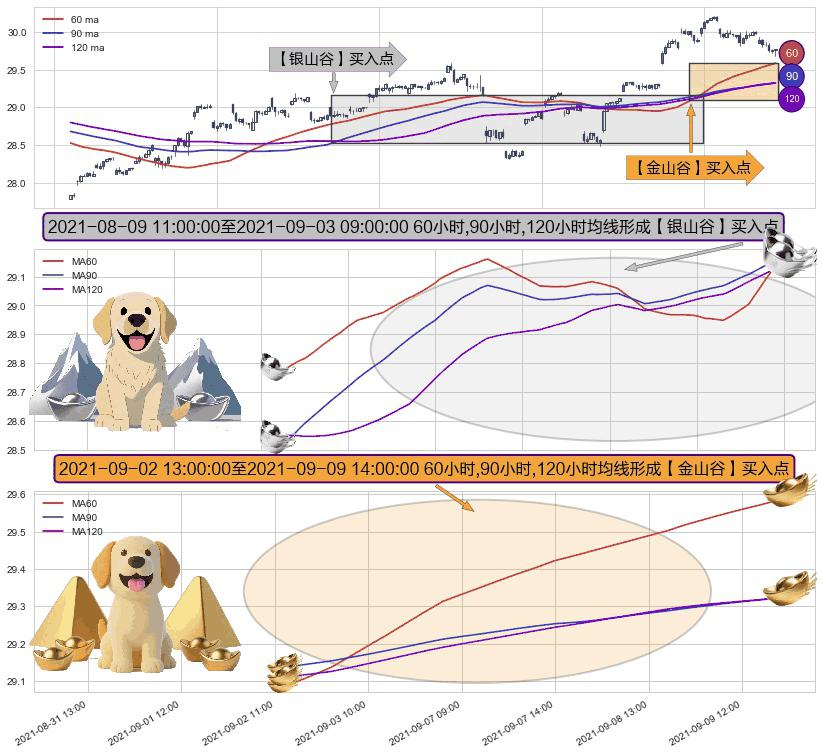 ⚀ 2021-09-02 14:00:00-小时至2021-09-09 14:00:00-小时显现 60小时-90小时-120小时均线 【金山谷】买入点 其再次确认了买入信号,可靠性更强,买入