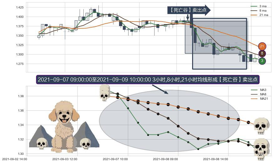 形态多维评估: ⚀ 2021-09-07 10:00:00-小时至2021-09-09 10:00:00-小时显现 3小时-8小时-21小时均线 【死亡谷】卖出点 看空信号,后市看跌,卖出