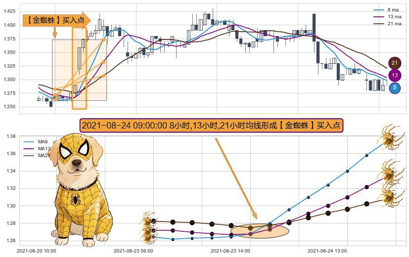 形态多维评估: ⚀ 2021-08-24 09:00:00小时显现 8小时-13小时-21小时均线 【金蜘蛛】买入点 看多信号,后市看涨,买入