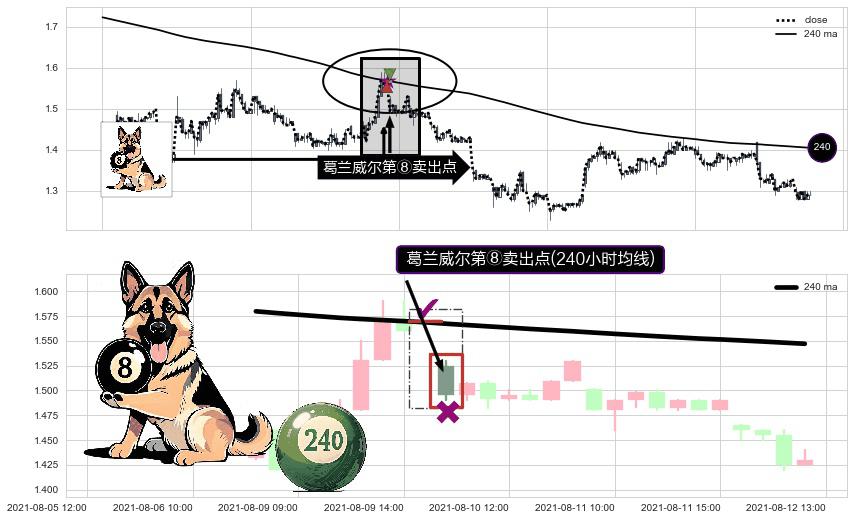 形态多维评估: ⚀ 2021-08-10 09:00:00-小时显现 葛兰威尔均线 240小时均线 第⑧卖出点 下降趋势的中继信号,后市看跌,卖出信号