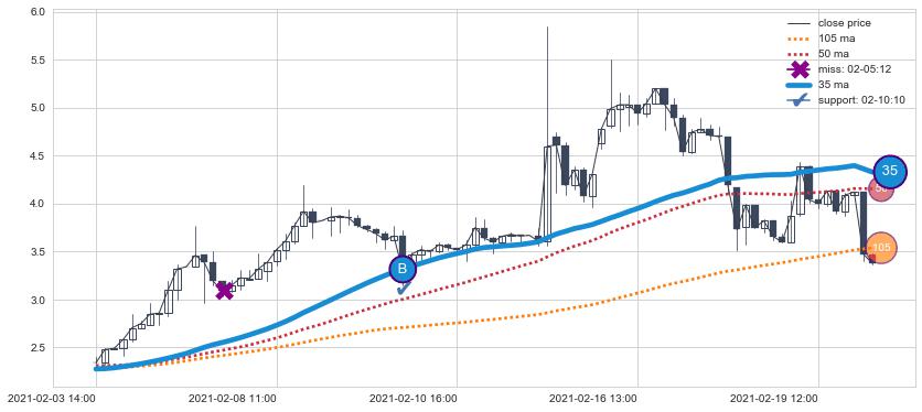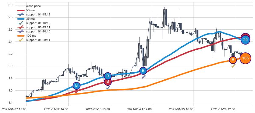 上涨趋势01-07 15:00-01-28 15:00,均线105, 50, 35确认关键支撑4处
