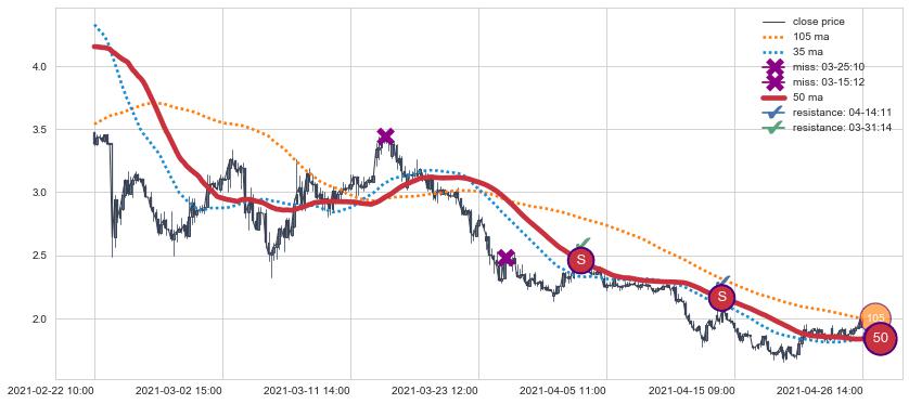 下跌趋势02-22 10:00-04-26 14:00,均线50确认关键阻力2处
