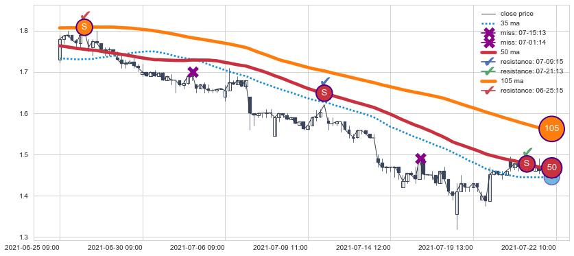 下跌趋势06-25 09:00-07-22 10:00,均线105, 50确认关键阻力3处