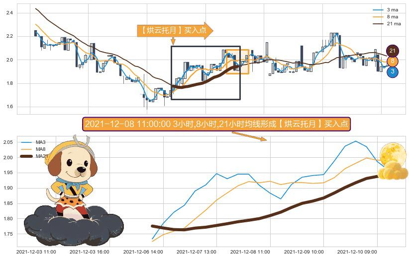⚀ 2021-12-06 13:00:00小时-2021-12-10 10:00:00小时显现 3小时-8小时-21小时均线 【烘云托月】买入点 看多信号,后市看涨,买入