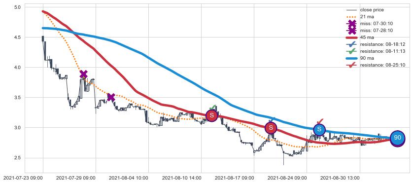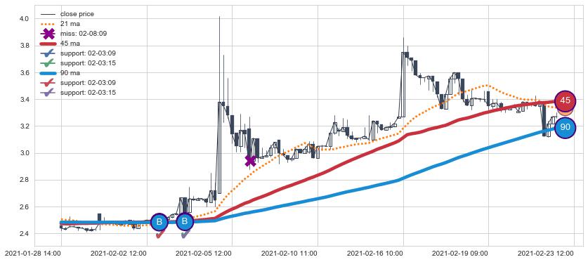 ⚁ MA3和MA8走势平行,且始终保持在短距离内,MA21始终在短中期均线下方,与短中期均线保持一定的距离,微微上行