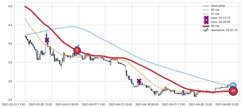 ⚄ 价格在均线遇到阻力后已再次向下回落了【较长】距离, 第⑦卖出点 阻力效果得到【初步确认】