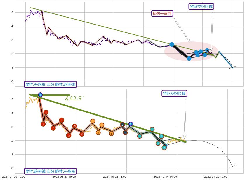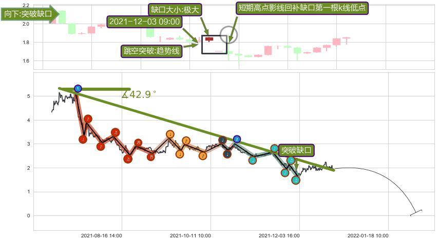 从2021-07-14 09:00至2021-12-13 15:00,共包含577个小时,阶段股价下跌-78.98%,阶段股价变动位移路程比: 1 : 11,下跌趋势角度: 42.9