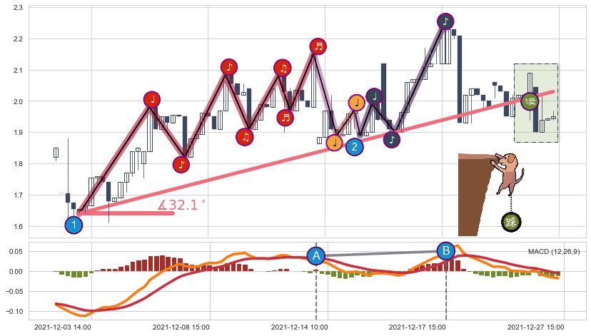 从2021-12-03 12:00至2021-12-13 16:00,共包含41个小时,阶段股价上涨29.21%,阶段股价变动位移路程比: 1 : 3,上涨趋势角度: 48.7