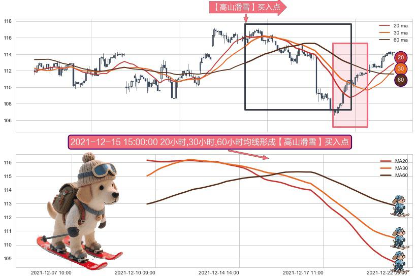 形态多维评估: ⚀ 2021-12-09 14:00:00小时-2021-12-21 13:00:00小时显现 20小时-30小时-60小时均线 【高山滑雪】买入点 看多信号,后市看涨,买入
