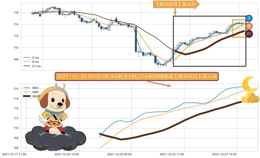 形态多维评估: ⚀ 2021-12-21 10:00:00小时-2021-12-27 16:00:00小时显现 3小时-8小时-21小时均线 【烘云托月】买入点 看多信号,后市看涨,买入