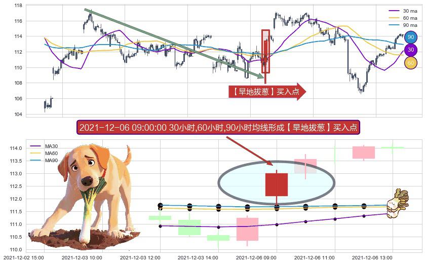 形态多维评估: ⚀ 2021-12-06 09:00:00小时显现 30小时-60小时-90小时均线 【旱地拔葱】买入点 看多信号,后市看涨,买入