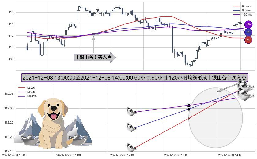 形态多维评估: ⚀ 2021-12-08 14:00:00-小时至2021-12-08 14:00:00-小时显现 60小时-90小时-120小时均线 【银山谷】买入点 看多信号,后市看涨,买入