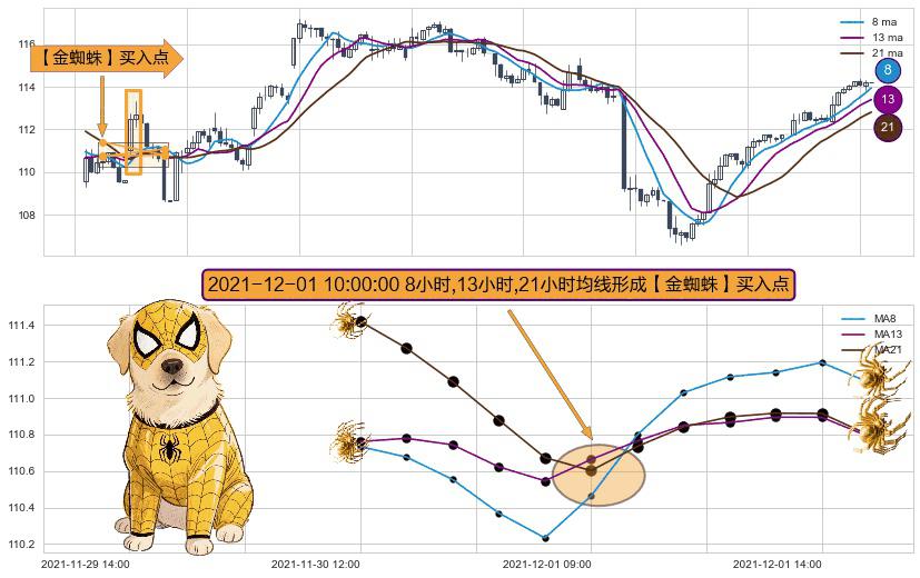 形态多维评估: ⚀ 2021-12-01 10:00:00小时显现 8小时-13小时-21小时均线 【金蜘蛛】买入点 看多信号,后市看涨,买入